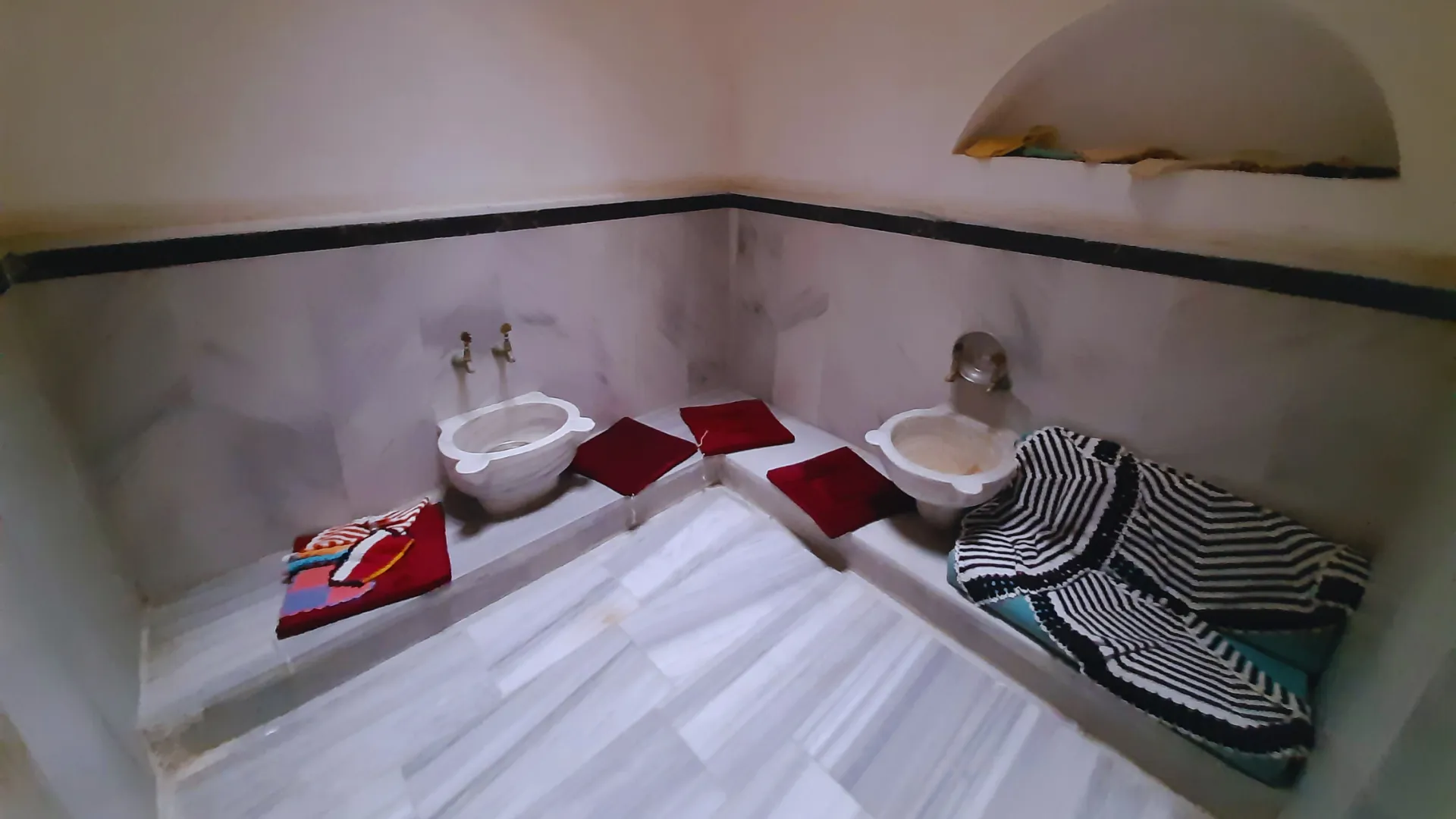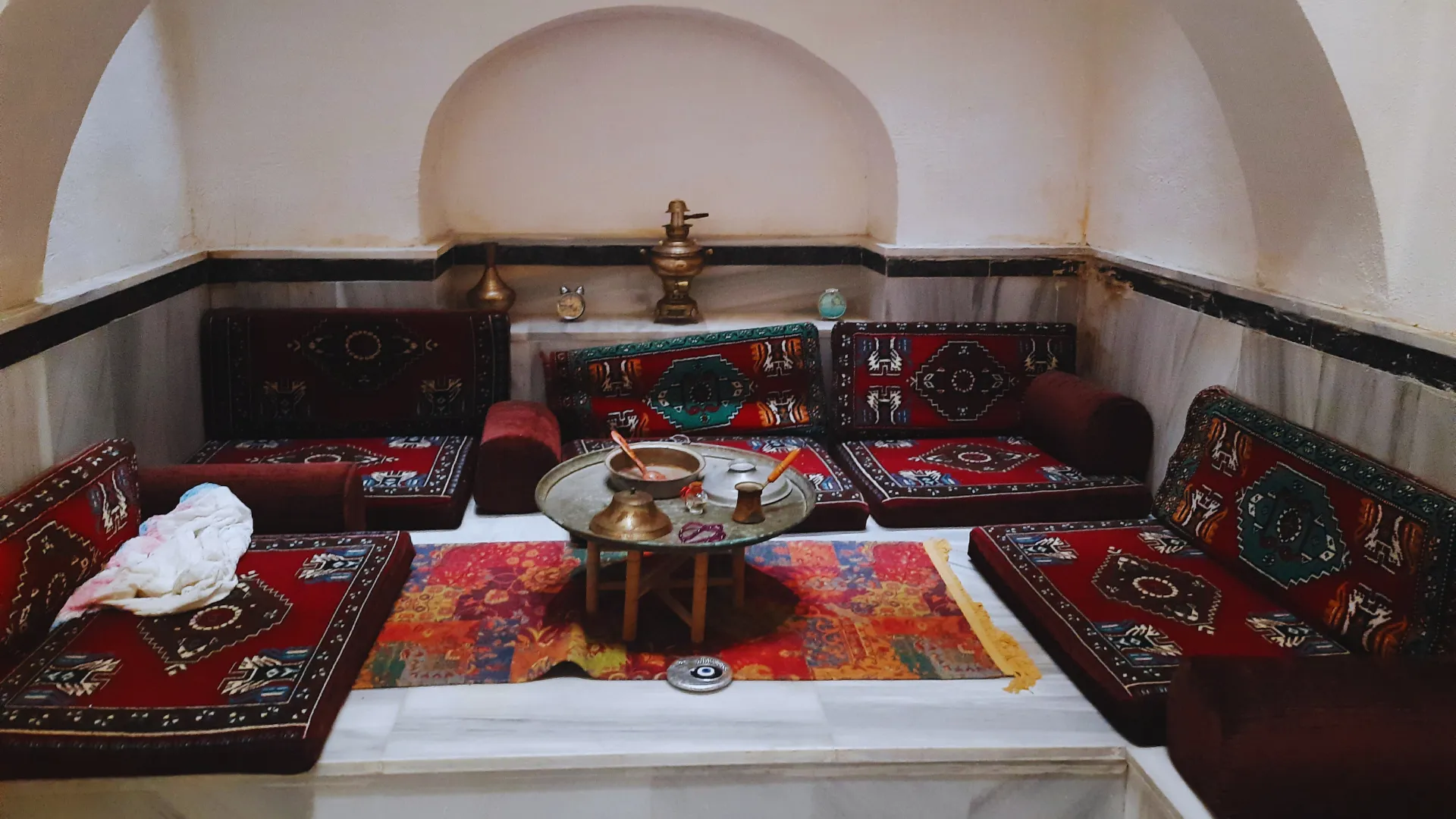 The historical bath consists of a rectangular plan, two small domed hot and cold sections. The spaces outside the domes are covered with a hipped roof with hedgehog eaves. Its walls are built with rubble stone. The hammam was recently restored and used as a cafe for a while.